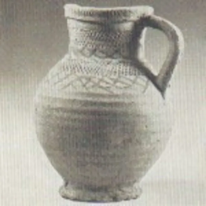 Dies ist ein Nachbau einer Ölkanne, die wahrscheinlich in der 2. Hälfte des 12. Jahrhunderts verwendet wurde. Es war Teil einer Ausgrabung von mehreren Keramik Gläser, Schalen und Tassen aus Pingsdorf in Deutschland.