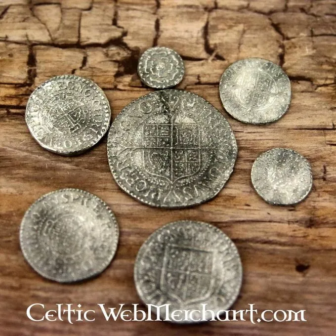 Dies ist eine Reihe von Replik Münzen aus der Zeit von König Karl I. von England. Er regierte von 1625 bis 1649 in der Gottesgnadentum Glauben und verheiratet mit einer römisch-katholischen Königin, Konflikte mit der protestantischen Oberschicht und Parlament entstanden ist. Dies führte zu seiner Festnahme, Versuch und Durchführung in 1649. Das Set besteht aus einem Schilling, sechs Pence, Groschen, drei Pence, Halfgroat, Penny und Pence, die alle aus Zinn.