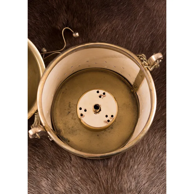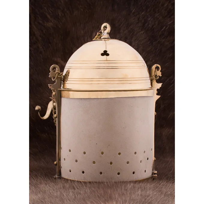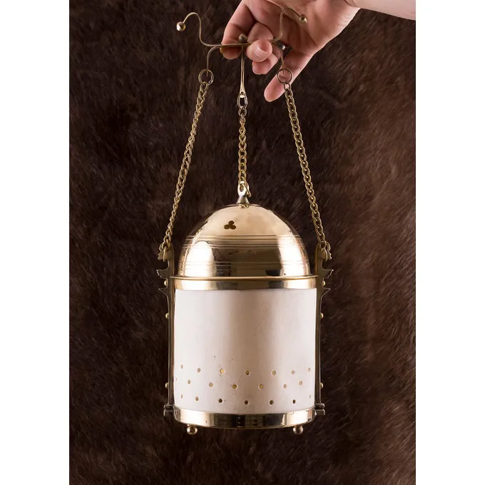 Diese römische Laterne basiert auf Originale aus dem 1. bis 3. Jahrhundert, gefunden in Pompeji, Libyen und England. So wurden diese Laternen der ganzen Römischen Reich verwendet. Die Laterne hat 3 Messing Ketten daran hängen. Es gibt auch einen Griff am Ende, so dass Sie mit der Laterne herumlaufen können, aber man kann es auch auf dem Tisch legen. Die Laterne ist aus Messing und Pergament mit Lüftungslöchern hergestellt. Das Innere der Laterne hat einen Ölbehälter, dass Sie für ein Öl nachfüllen herausnehmen können. Dann können Sie die Laterne in einer authentischen Art und Weise mit Pflanzenöl und einem Docht anzünden. Sie können auch die Ölbehälter herausnehmen und das Innere mit einem Teelicht oder größerer Kerze beleuchten. Dies ist ein wunderbares Accessoire für Roman Nachstellung, lebendige Geschichte und LARP. Es ist auch ein Kunstwerk zu Hause im Garten und Wohnzimmer, die Sie sicherlich für viele Jahre genießen.
