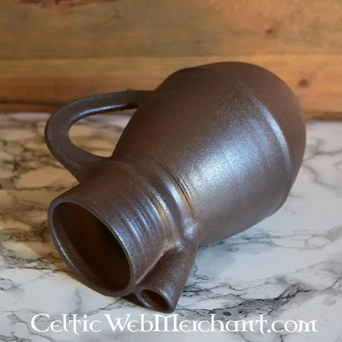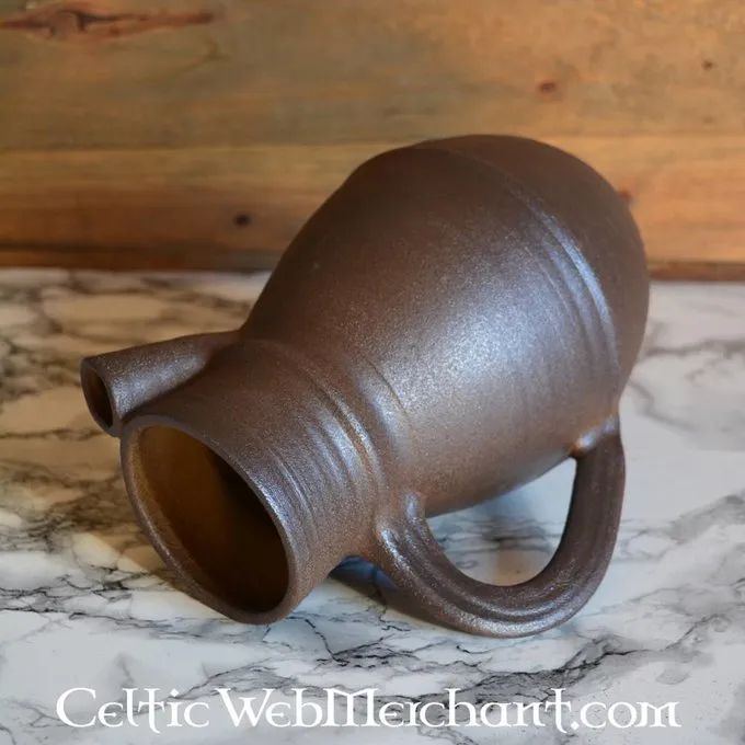 Der Krug hat eine Länge von 18 cm und einer max. Durchmesser von 48 cm. Der Krug verfügt über eine praktische Öffnung zum Ausgießen. Es ist aus dem gleichen Ton wie das Original in Dorestad gefunden.