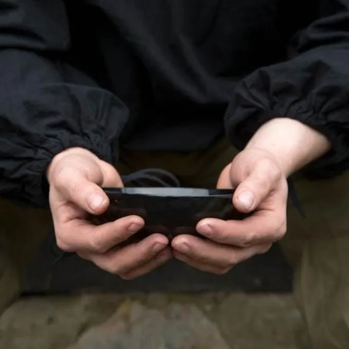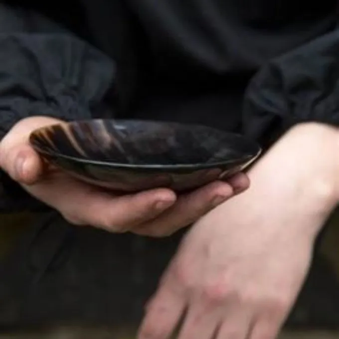 Hornschalen wurden jahrhundertelang in ganz Europa verwendet. Diese Schale ist innen so behandelt, dass sie zum Verzehr von Lebensmitteln geeignet ist. Das Horn ist glatt poliert und hat eine Lackschicht. Hinweis: Nicht für heiße Flüssigkeiten geeignet. Eine perfekte Ergänzung zu Ihrer Nachstellung und Ihrer LARP-Ausrüstung.