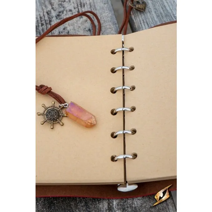 Dieses Pirate Style Journal eignet sich perfekt für Cosplay, Larp, andere Rollenspiele, als Geschenk oder nur für sich selbst. Das Buch ist ein Ringbindemittel mit 55 Blättern. Der Vorteil ist, dass das Buch nicht voll werden kann: Wenn die Seiten voll sind, nehmen Sie sie heraus und legen leere Seiten ein. So können Sie das Buch jedes Mal für ein anderes Rollenspiel oder ein anderes Thema wiederverwenden. Das Cover und die Spitze bestehen aus künstlichem Leder. Das Tagebuch ist mit 3 Anhängern verziert: ein Schiffsrad, ein Anker und ein Kristall. Sie können das Buch an Ihren eigenen Stil anpassen, indem Sie andere Kleiderbügel hinzufügen oder das Cover selbst malen.