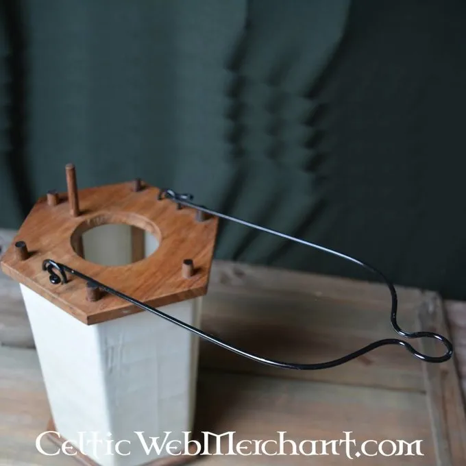 Diese Laterne ist nach einigen frühen mittelalterlichen Originalen. Sie besteht aus einem Holzrahmen mit Fenstern aus Rohhaut, durch die das Licht leuchtet. Laternen wurden häufig wegen Brandschutz verwendet wird.