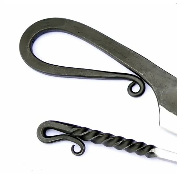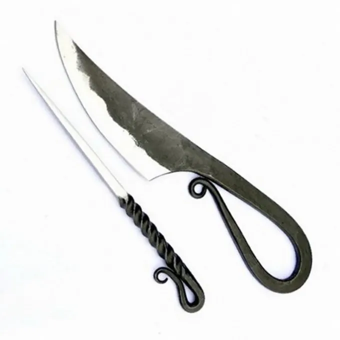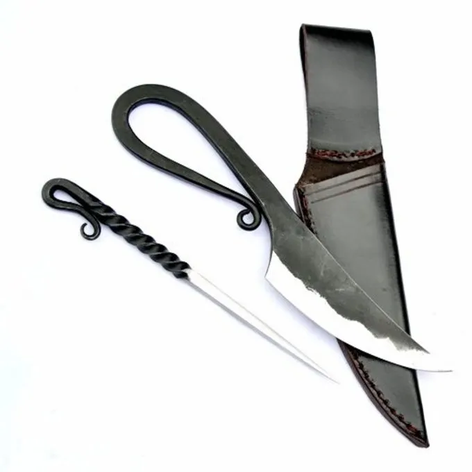 Dieser handgemachte Besteckset auf verschiedenen prähistorischen Originalen. Das Besteck-Set besteht aus einem Messer und Essen holen. Beide sind aus Kohlenstoffstahl. Das Messer wird auf eine Härte von 58-60 HRC.