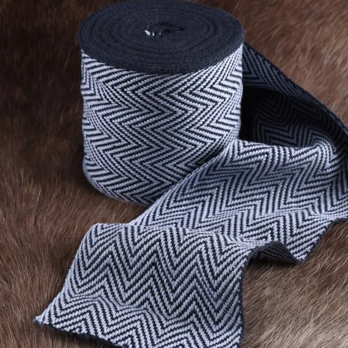Der 10 cm breite Gewebestreifen wird auf einem zusätzlichen schmalen Webstuhl gewebt und hat daher sehr ordentlich fertiggestellte Kanten und ist in einem Fischgrätmuster gewebt. Die Fischgrät-ist ein historisches Gewebe und sehr geeignet für die Herstellung von Reenactment Zubehör. Verkauft in Rollen von 7 Metern ist der Stoffstreifen perfekt für die eigene Bein Umhüllungen machen (7 Meter reichen für die Herstellung von 1 Paar), Riemen, verziert Ärmel und Bekleidungs Verzieren Säume. Herringbone Gewebe waren ein Symbol für Status in den Früh- und Hochmittelalter.