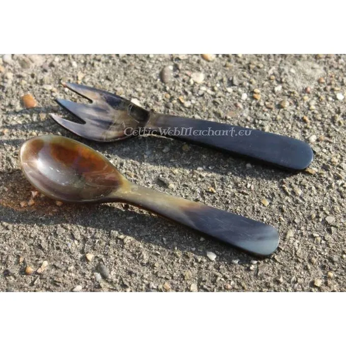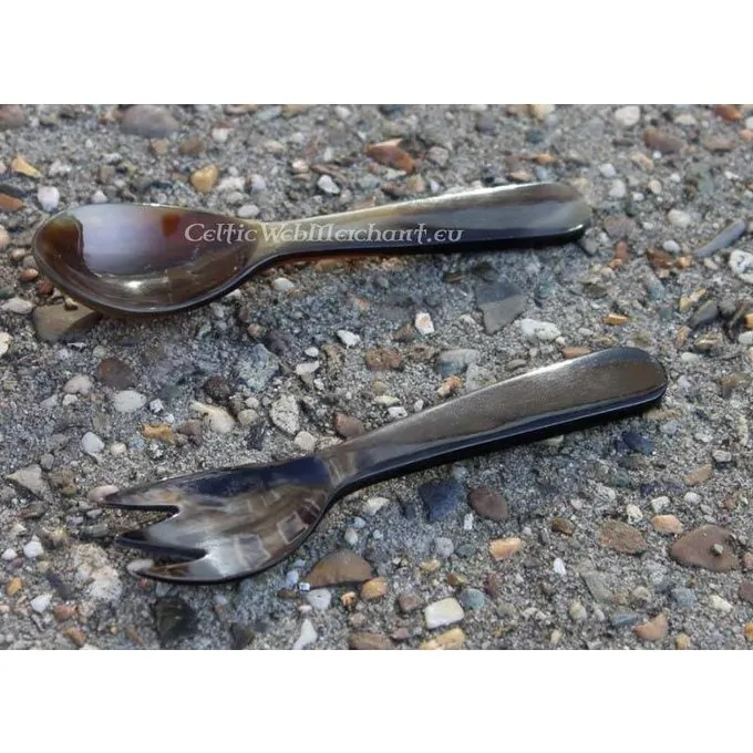 Dieses Set besteht aus einem Löffel und eine Gabel von Horn, die beide mit einer Länge von ca. 11 cm. Weil Horn ein Naturprodukt ist, kann die Farbe pro Satz unterscheiden.