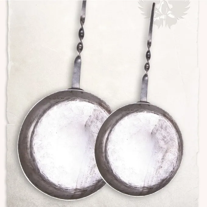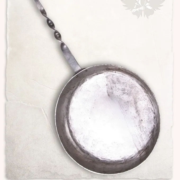 Diese Pfanne basiert auf mehreren historischen Originalen. Eine feste Eisen Bratpfanne ist in jeder Nachstellung und LARP encampment unverzichtbar. Diese Pfanne ist aus Schmiedeeisen. Auf der Rückseite des Handgriffs hat es einen Haken, mit dem sie auf dem Stativstange aufgehängt sein, zum Beispiel. Nach dem Gebrauch kann diese Pfanne am besten mit Olivenöl gegen Rost behandelt werden. Die Pfanne ist in einer kleinen und großen Größe zur Verfügung.