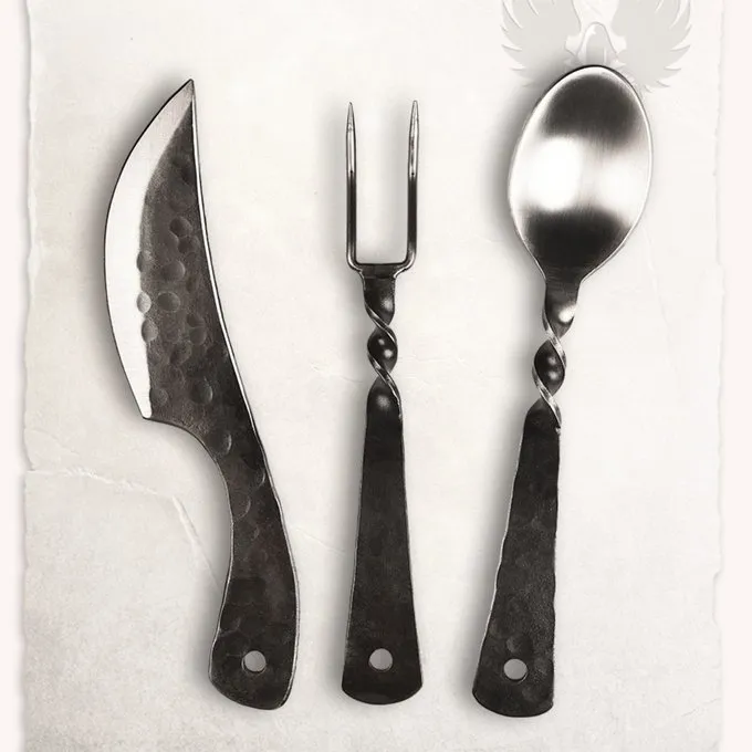 Dieses traditionelle Besteck aus Edelstahl handgeschmiedet. Die Gabel und Löffel haben einen dekorativen verdrillten Griff. Dieses Besteck-Set ist ideal für mittelalterliche Veranstaltungen, Reenactment oder LARP Lagerstätten.