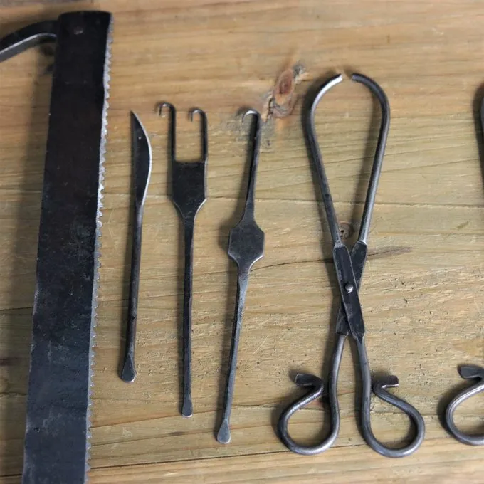 Material: Schmiedeeisen / Säge: 31 x 16 cm / Schere: 20 x 3/7 cm / Doppelhaken: 25 x 2,5 cm / Einzelhaken: 25 x 2,5 cm / Wundklammer: 21 x 4,5 / 6 cm / Skalpell: 17 cm / Auf einem historischen Original basiert