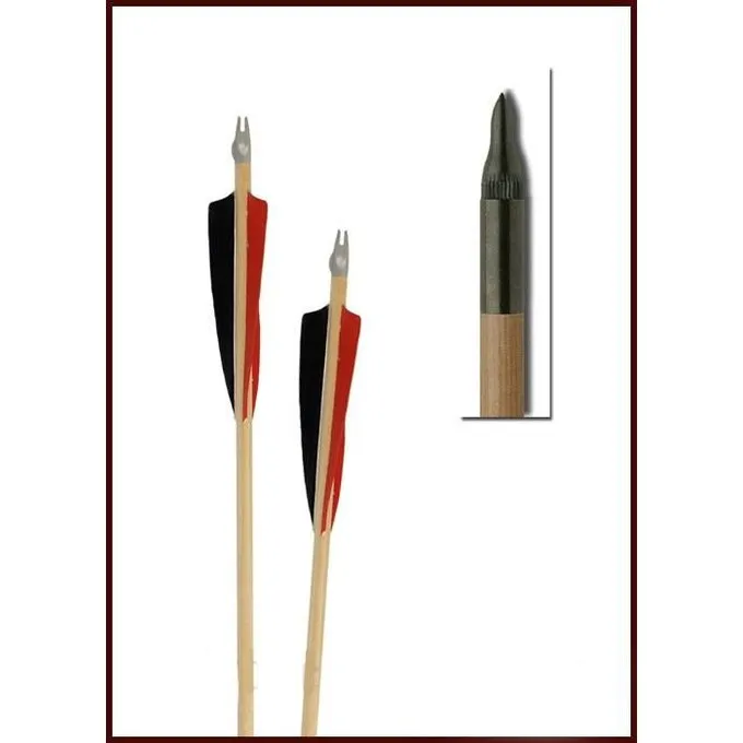 Dies ist ein handgefertigter Pfeil mit einer Länge von 80 cm aus Holz aus der Tanne. Es wiegt ca.. 11 Gramm und ist mit einer Messing geliefert Pfeilspitze (nicht gebunden) von 6 Gramm. Die Länge der Federn ist 13 cm und sie ist in den Farben schwarz / rot / rot.