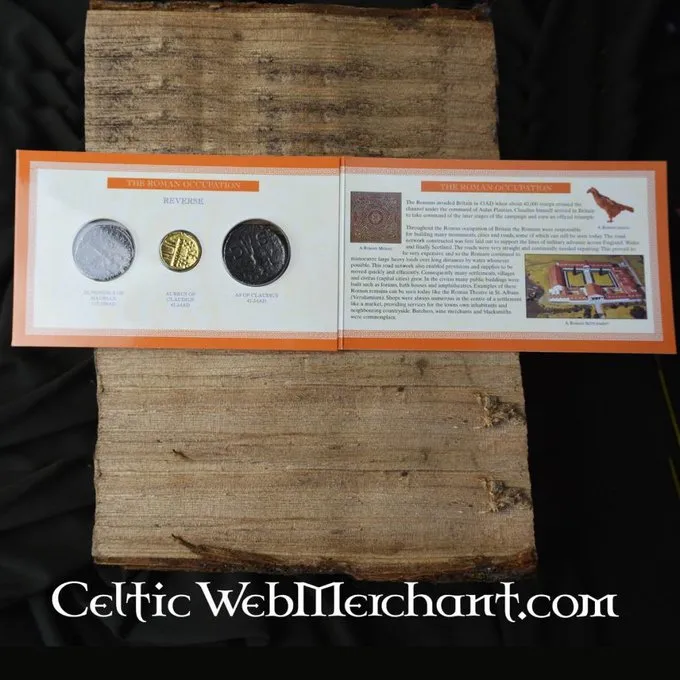 Die Römer überquerten den Kanal in 43 AD mit einer Armee von 40.000 Soldaten. Später kam Kaiser Claudius sich Britannia Befehl über seine Truppen zu führen. Dieses Set enthält einen aureus dieses Kaisers. Diese aureus wurde zwischen 41 und 54 AD geprägt und enthält die Inschrift DE BRITANN als gefeierten Sieg.